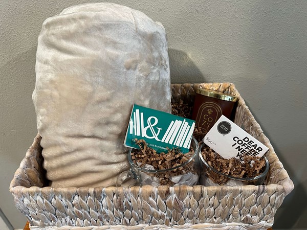 Cozy blanket, coffee mugs, coffee gift card, and a Barnes and Noble giftcard