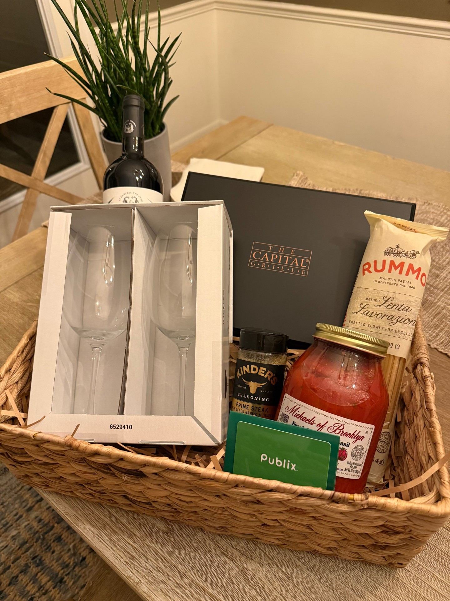Basket Includes: The Capital Grille Steak Night Seat (for 4), 1 Bottle of Red Wine, 2 Wine Glasses, Pasta & Steak Fixins, and a $50 Publix Gift Card