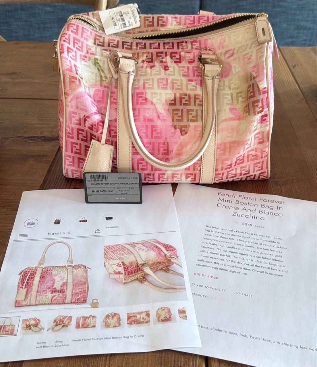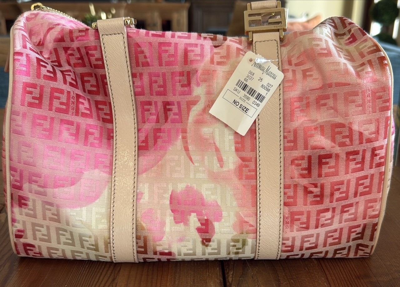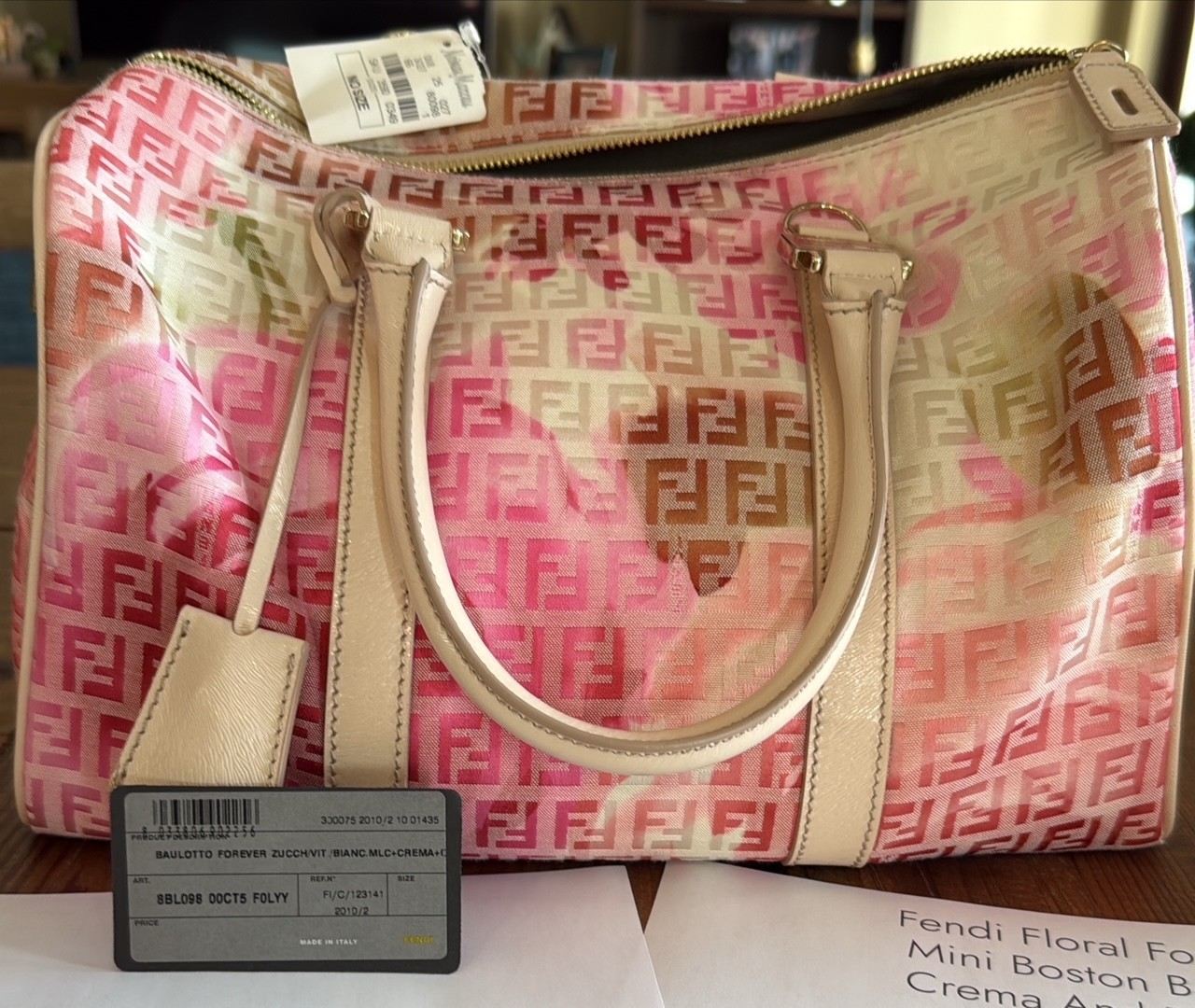 Never Worn, Authentic Fendi Floral Forever Mini Boston Bag in Crema and Bianco Zucchino. Original Neiman Marcus Tag Attached and Original Authenticity Card.