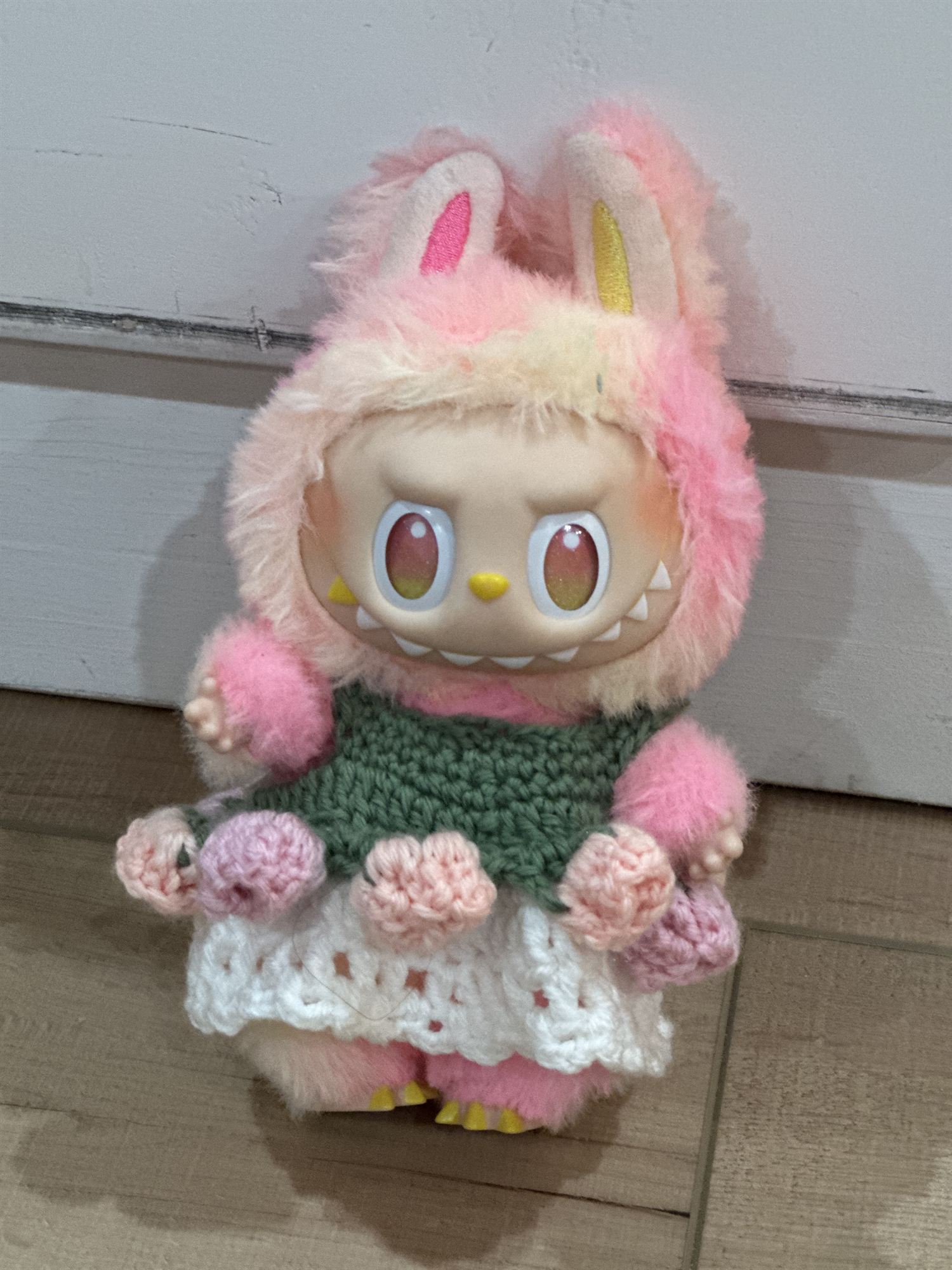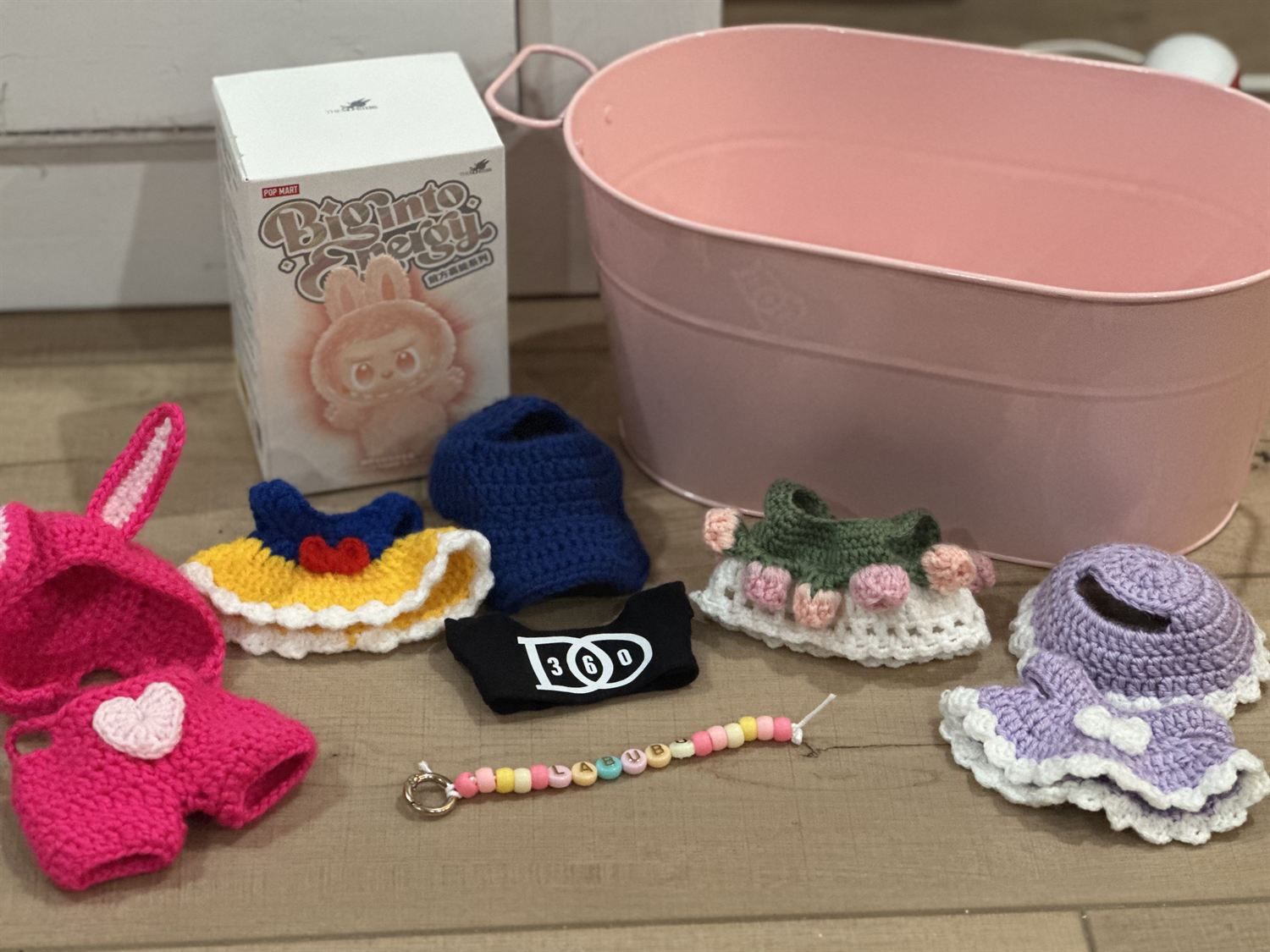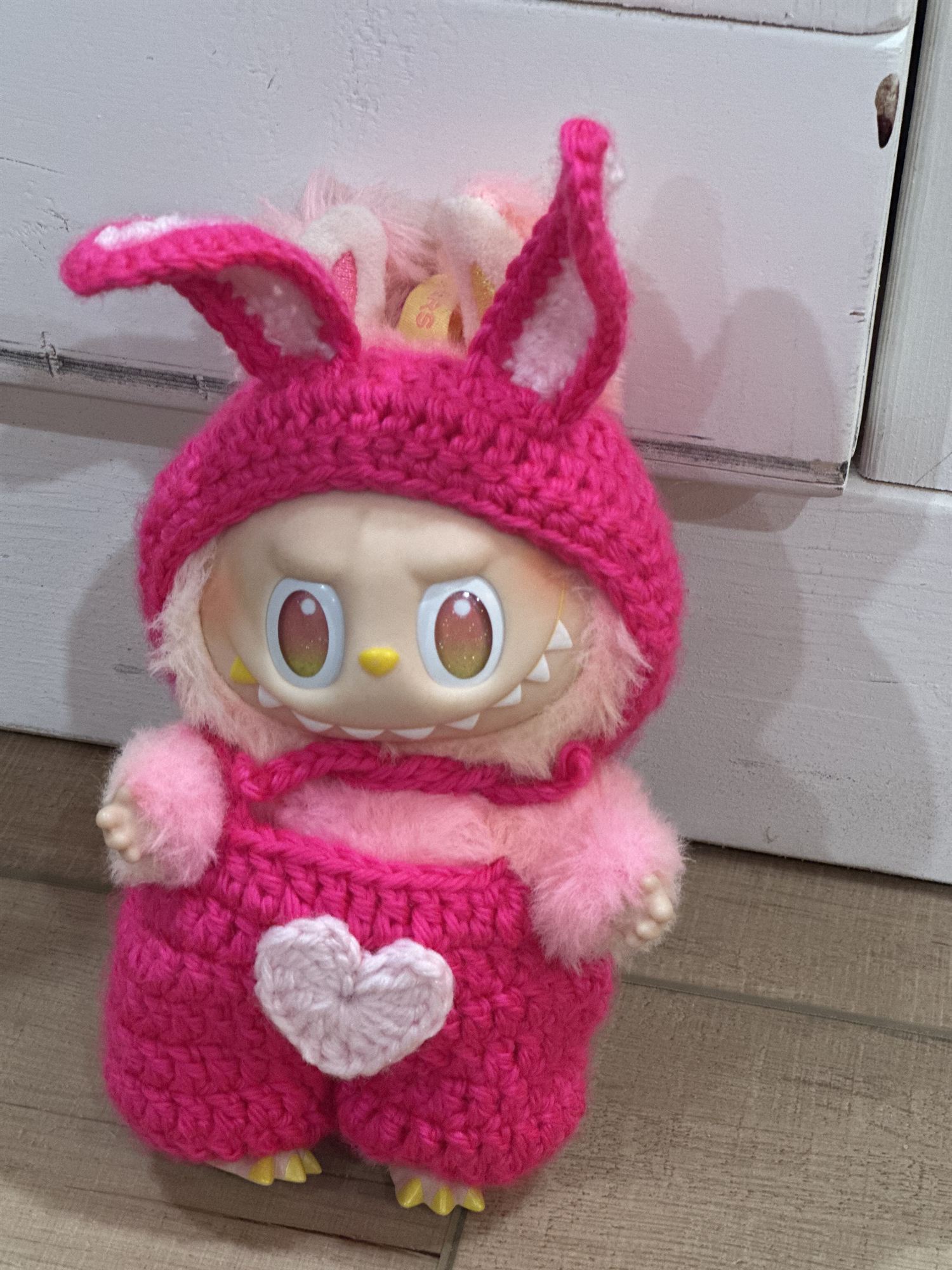 1 Authentic "Big Into Energy" Labubu Blind Box from Pop Mart, 5 Custom Made Labubu Outfits Made By Stitch Perfect, 1 "Labubu" Waterbottle/Bag Tag, and 1 Clasp Protector