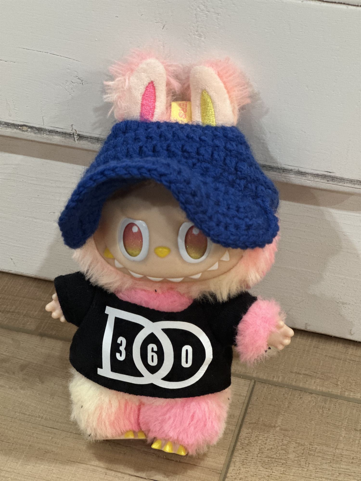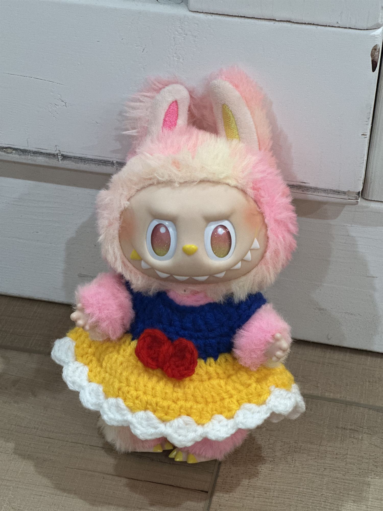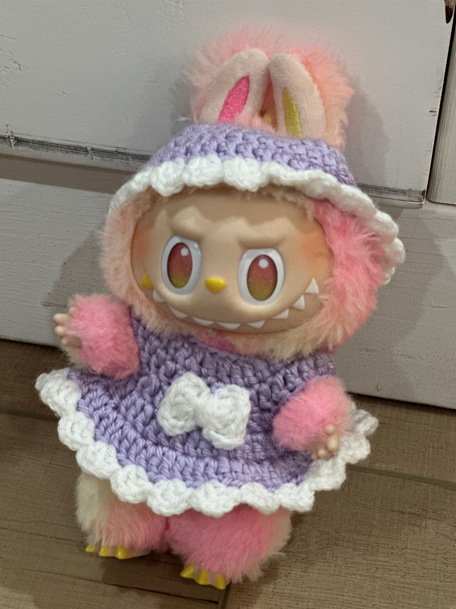 1 Authentic "Big Into Energy" Labubu Blind Box from Pop Mart, 5 Custom Made Labubu Outfits Made By Stitch Perfect, 1 "Labubu" Waterbottle/Bag Tag, and 1 Clasp Protector