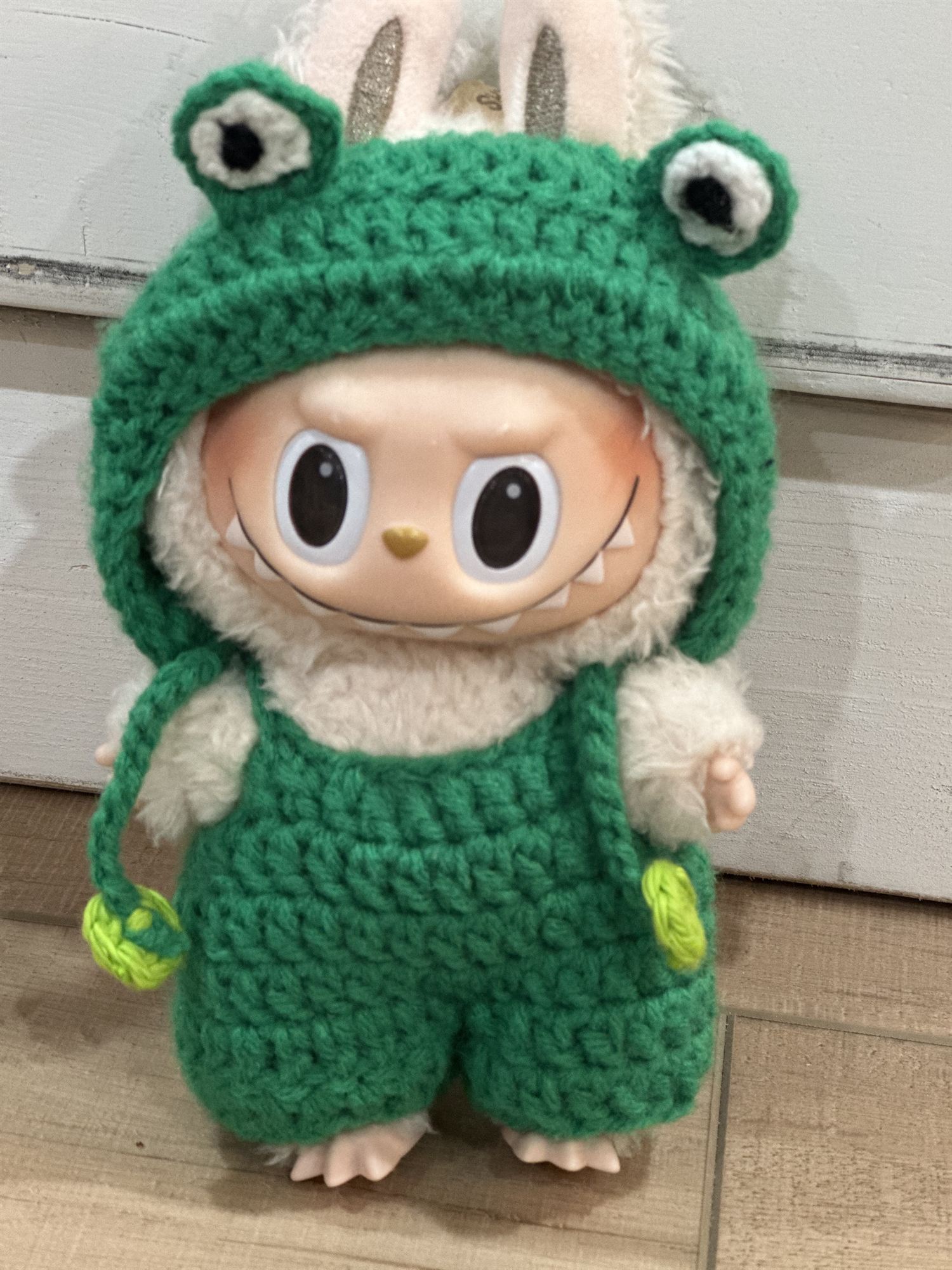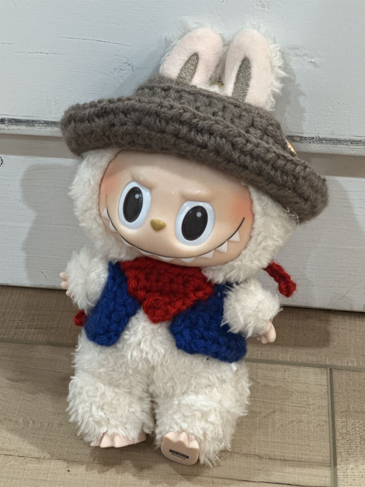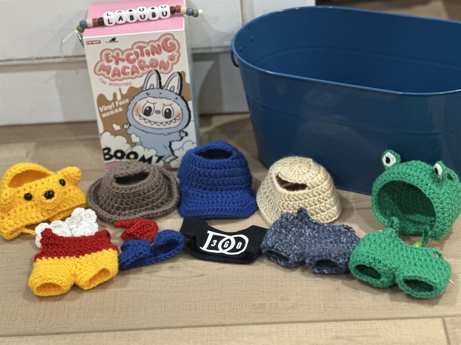 1 Authentic "Exciting Macarons" Labubu Blind Box from Pop Mart, 5 Custom Made Labubu Outfits Made By Stitch Perfect, 1 "Labubu" Waterbottle/Bag Tag, and 1 Clasp Protector