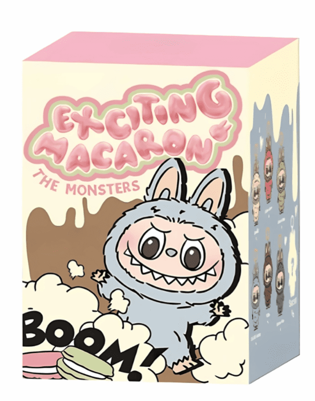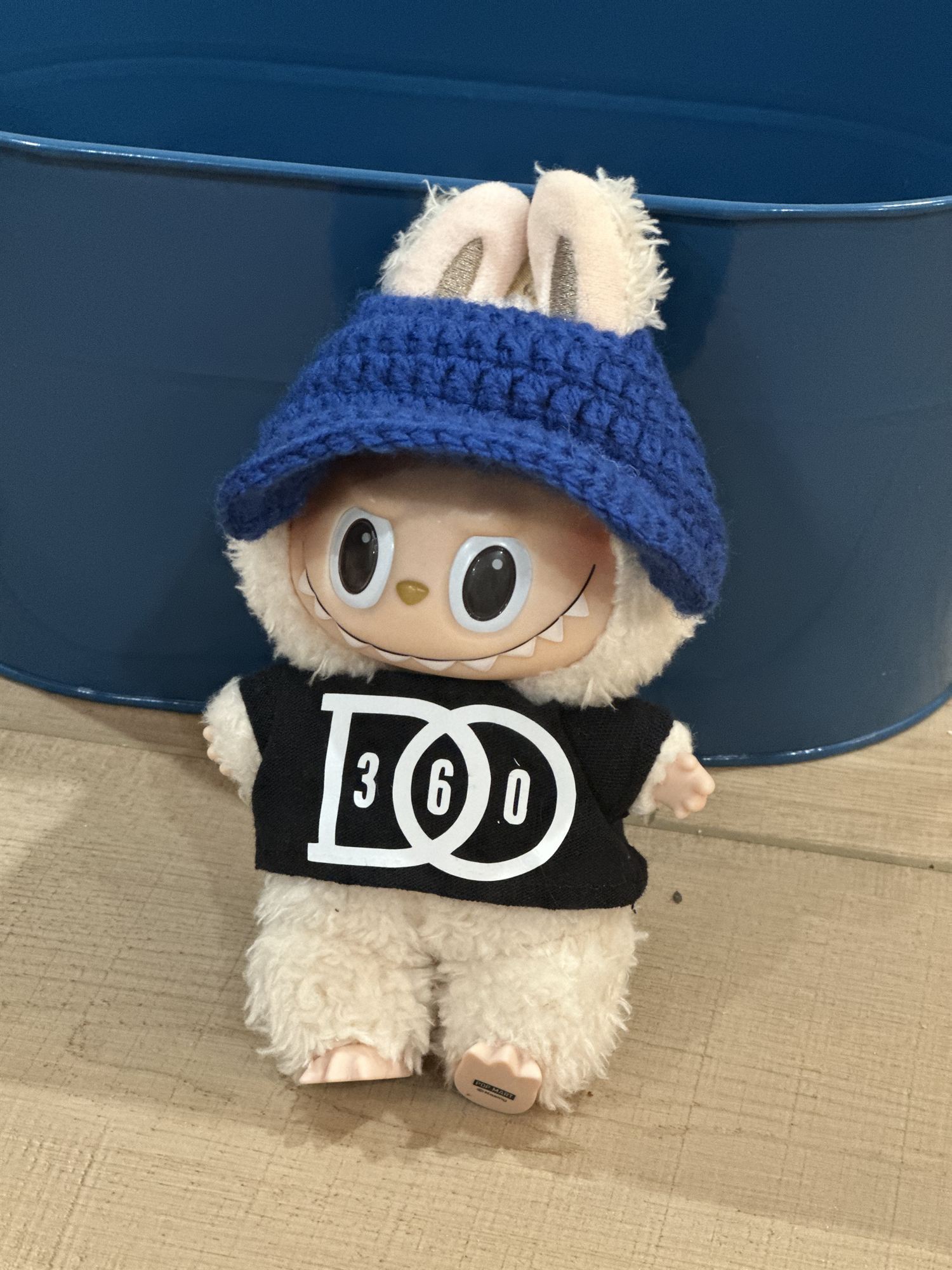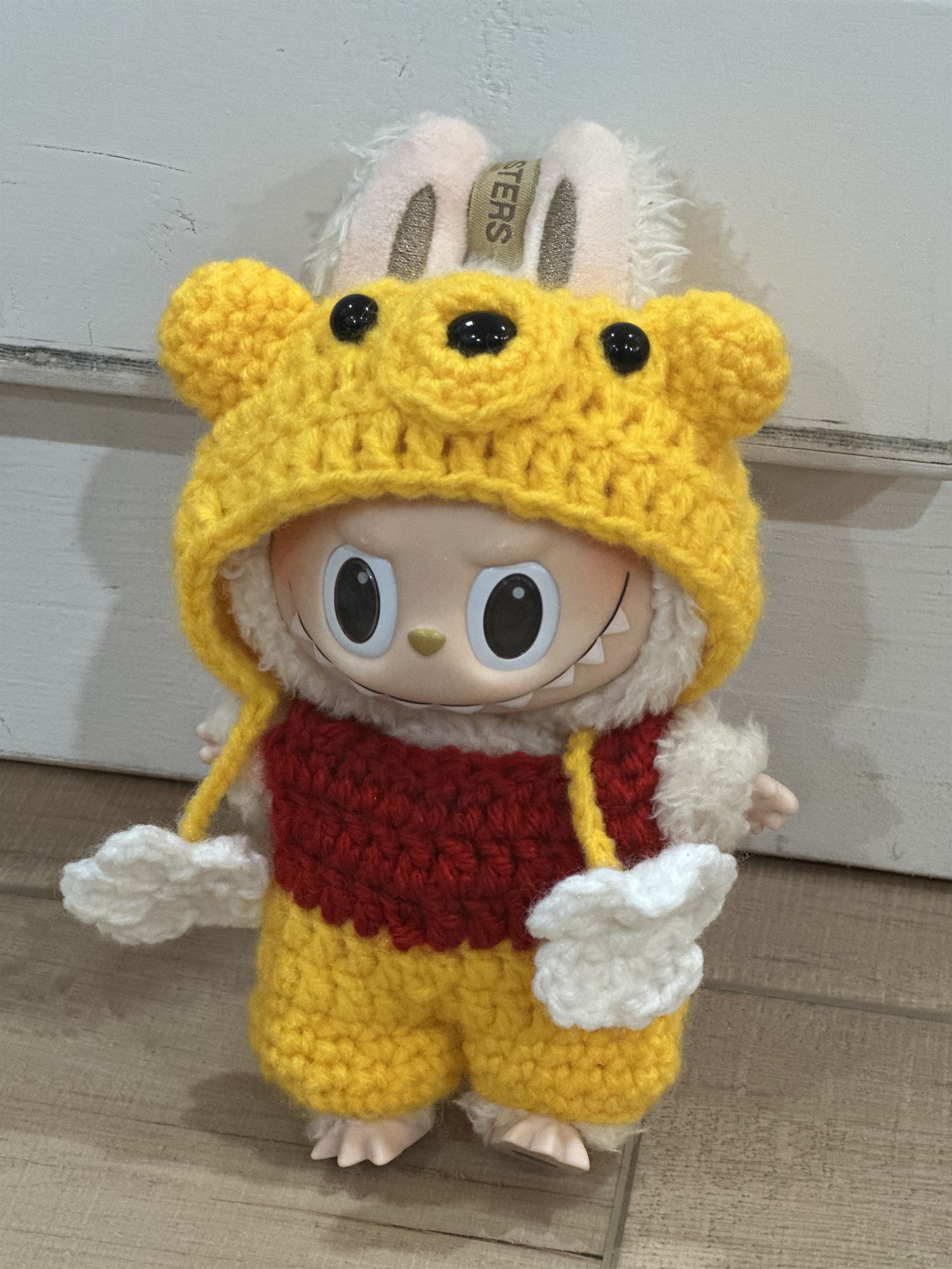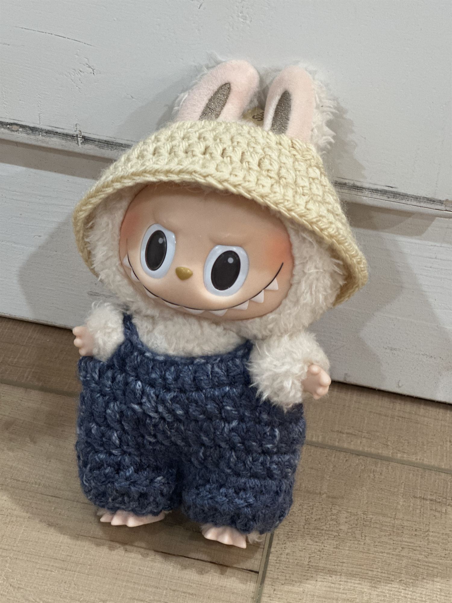 1 Authentic "Exciting Macarons" Labubu Blind Box from Pop Mart, 5 Custom Made Labubu Outfits Made By Stitch Perfect, 1 "Labubu" Waterbottle/Bag Tag, and 1 Clasp Protector