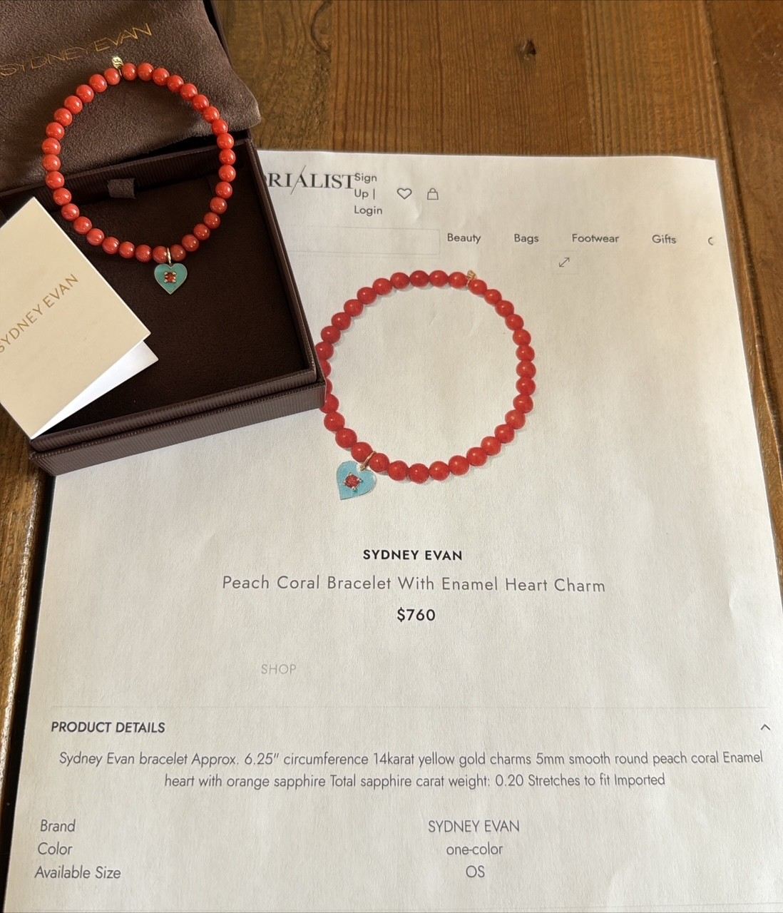 Sydney Evan 14K Peach Coral with Enamel Heart Charm. 14K Yellow Gold Charm 5mm Smooth Round Peach Coral Enamel Heart with Orange Sapphire. Total Sapphire Wt. 0.20