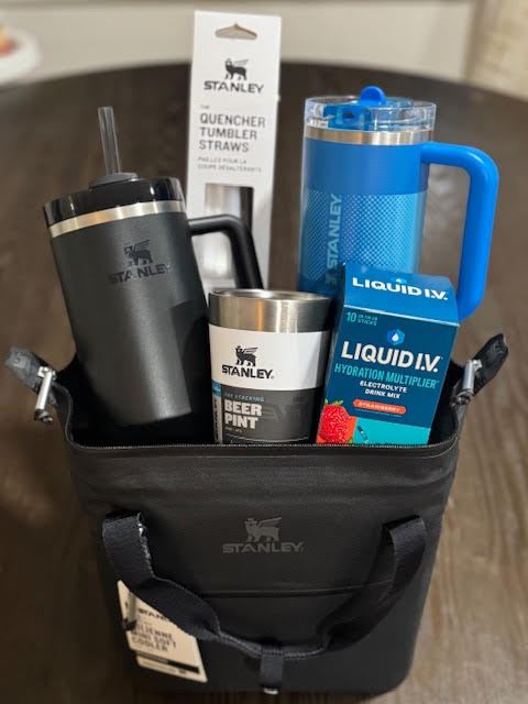 Basket Includes: Black Stanley Mini Cooler, 40 oz. Black Stanley, 30 oz. Blue Stanley, White Stanley Beer Pint, Extra Straw Set, Box of Liquid IV.