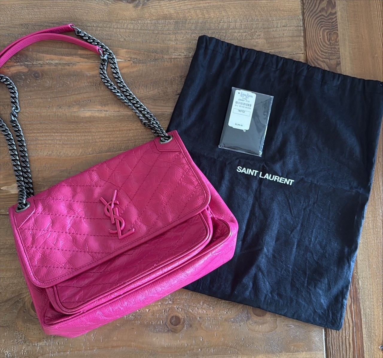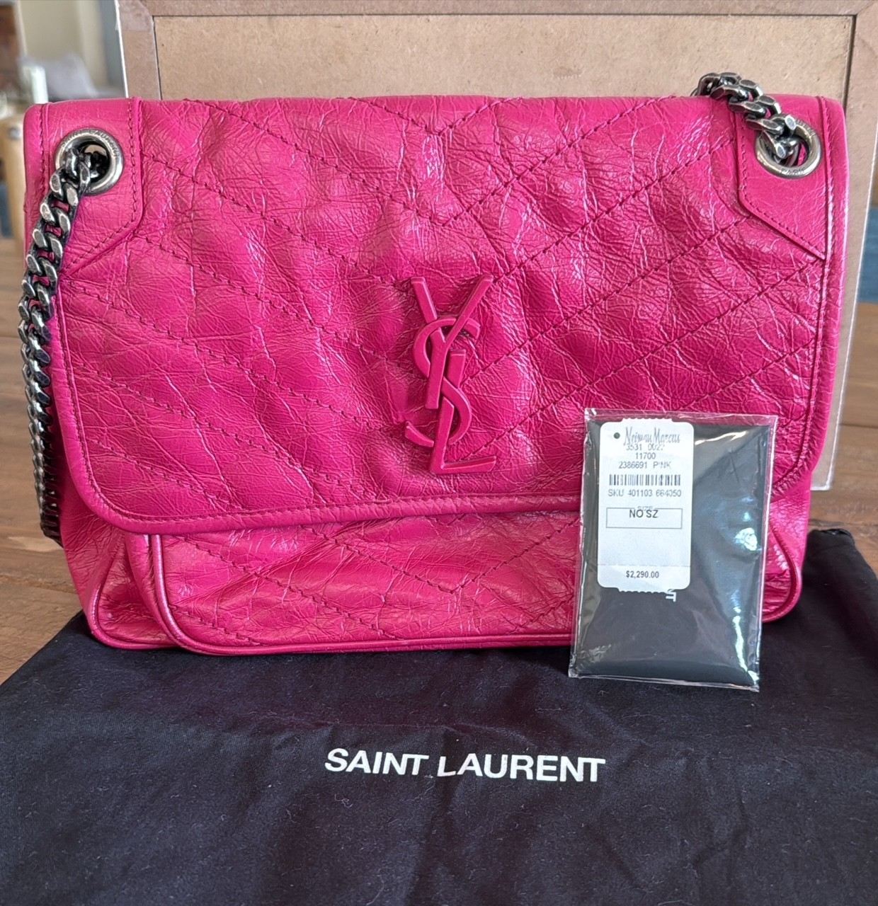 Authentic SAINT LAURENT Matelasse Monogram Baby Niki Chain Satchel in Freesia. Shoulder Tote Features Chic Crinkled Chevron Quilting in Pink, an Aged Silver Chain-Link Shoulder Strap with a Matching Leather Shoulder Pad and a Rear Patch Pocket. The Frontal Flap Features a Prominent YSL Monogram Detail and Opens to a Partitioned Black Fabric Interior with Pockets. In pauthentic SAINT LAURENT Matelasse Monogram Baby Niki Chain Satchel in Freesia. shoulder tote features chic crinkled chevron quilting in pink, an aged silver chain-link shoulder strap with a matching leather shoulder pad and a rear patch pocket. The frontal flap features a prominent YSL monogram detail and opens to a partitioned black fabric interior with pockets. In Perfect Unworn Condition. Comes with Dust Bag and Original Neiman Marcus Price Tag.