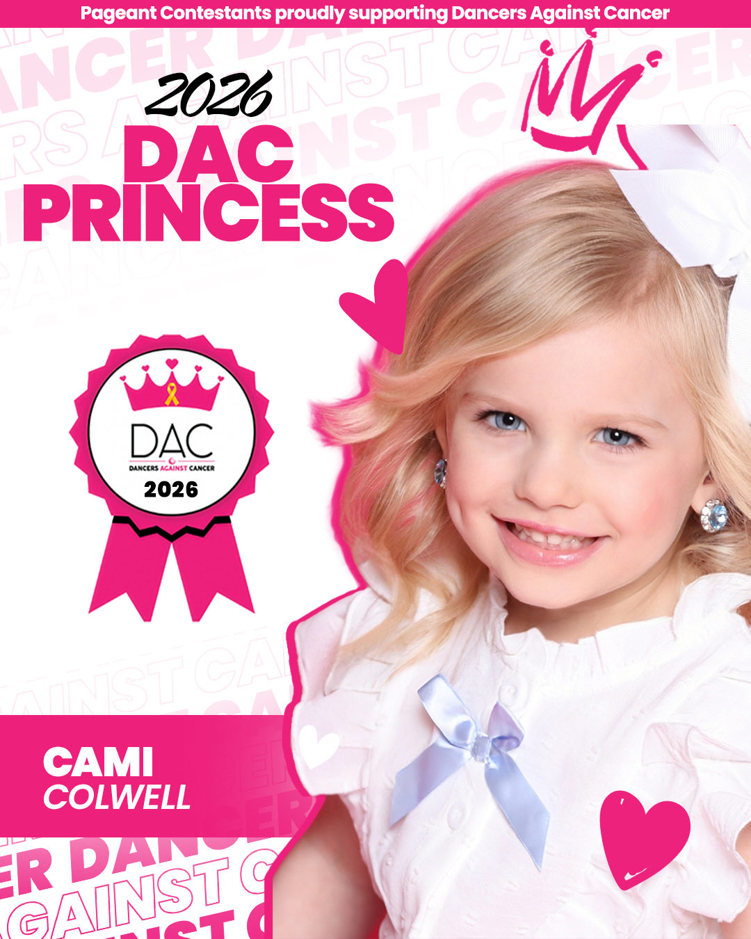 Service is at the center of everything Cami does. She is the founder of her platform, Cami’s Jammies, where she collects pajamas to donate to children in hospitals to help them feel loved, cozy, and cared for during difficult times. Cami’s biggest role model is her big sister, Caleigh, and she proudly works alongside her whenever she can—assembling care kits for kids in hospitals, making handmade cards, and visiting local senior living centers to spread joy. Cami is honored to be involved with Dancers Against Cancer, and hopes to continue to prove that even the littles of kids can make a BIG difference!
