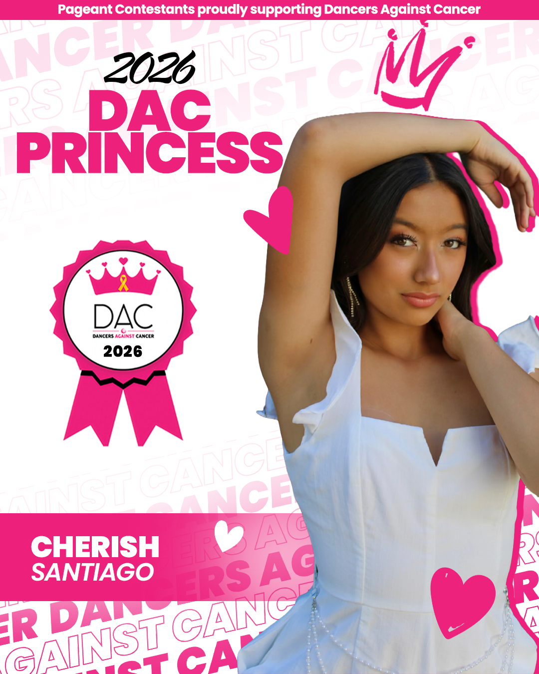 Hi there! My name is Cherish Santiago one of your DAC Princesses! You may also know me as your National United Miss West Coast Teen or your Riverside County Cinderella Woman. At the age of 16 my mom was diagnosed with stage 4 colon cancer. From this followed every possible feeling of fear, doubt, sadness, and worry. But through the light of hope and faith, I build my volunteer program Once Upon a Visit, founded off of her daily passion, drive, and displayed strength. Every individual who fights the unknowns of cancer deserves to feel that same light of hope and faith.