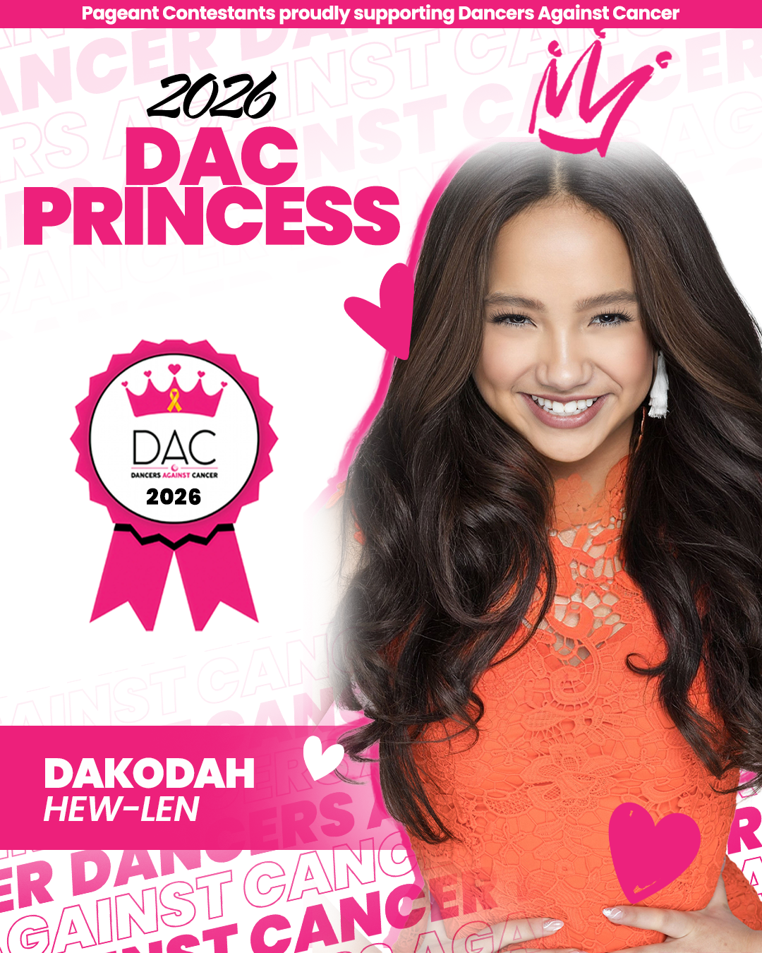 Dakodah Hew-Len is serving in her third year as a Dancers Against Cancer Princess and is deeply committed to supporting dancers and families affected by cancer. She has attended the Industry Dance Awards and has organized several fundraisers, helping raise meaningful awareness and support for the DAC mission.